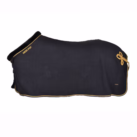 Lyxigt fleecetäcke i tidlös design med exklusiva passpoaler, flätdetaljer baktill och faux fur krage. Frontspänne i läderimitation samt avtagbara kryssgjordar under magen. Förstärkt med polyesterfoder vid bogen för minskat skav. HS brodyr vid halsen och elegant metallbricka. Perfekt tävlingstäcke!